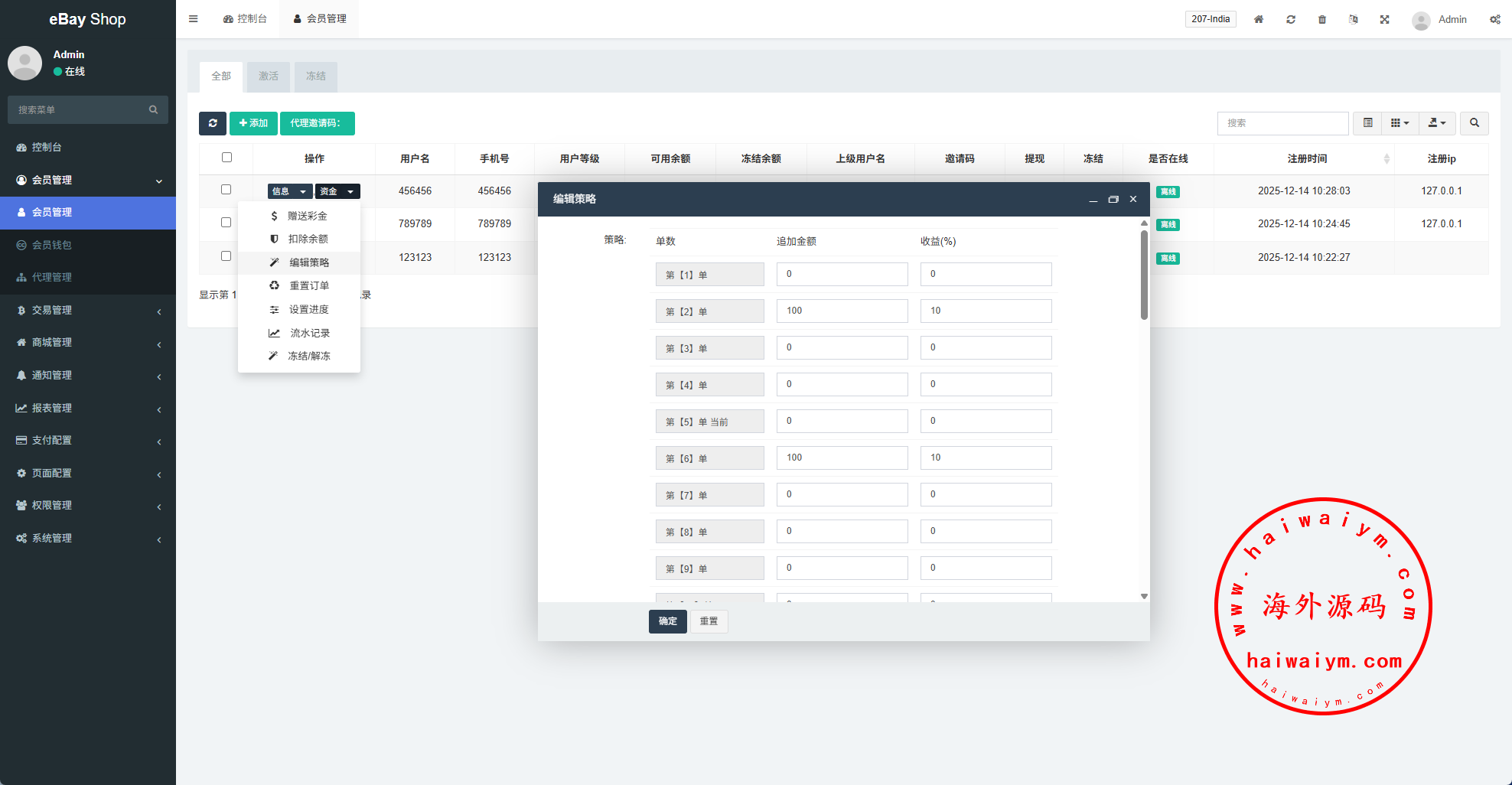 支持单独设置某用户禁止提现,或冻结;