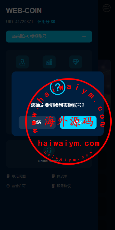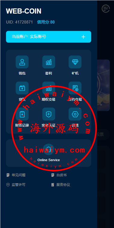 支持模拟账号,期权交易,合约交易,质押,信用分,贷款,实名认证等功能