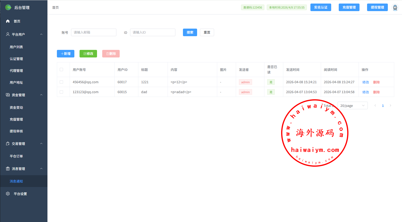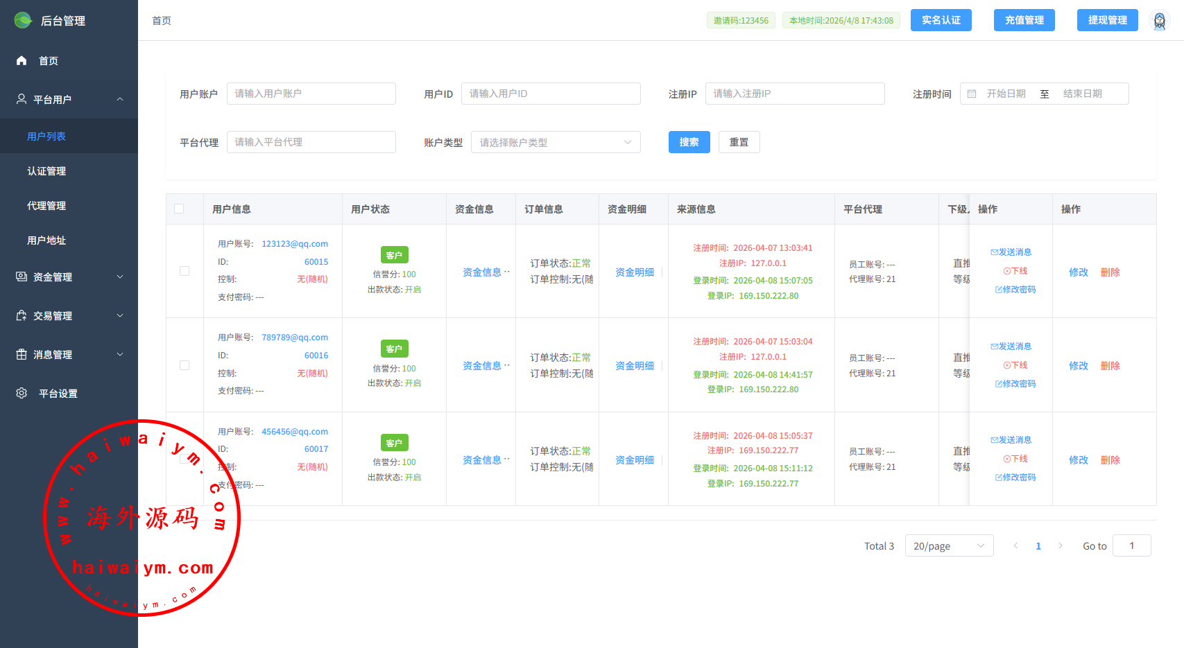 支持信用分,实名认证,消息发送,用户控制等功能