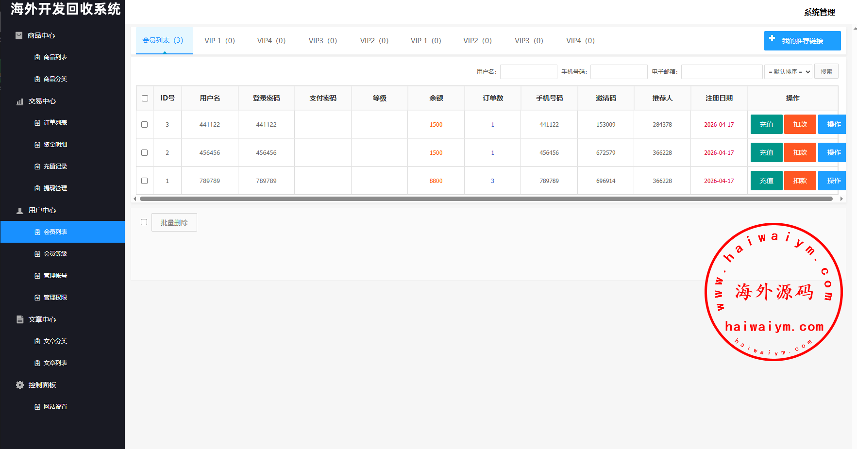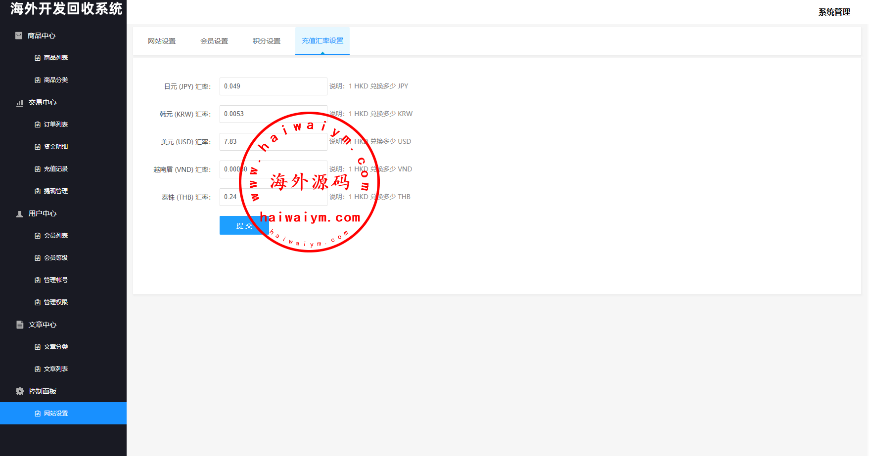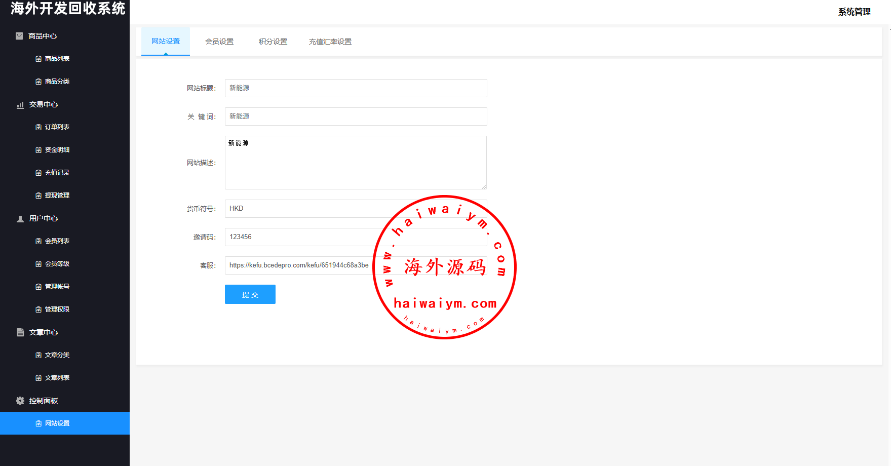 系统支持:访问邀请码,自定义回收价格,信用分,充值汇率,默认货币,权限代理等功能