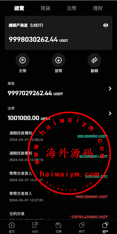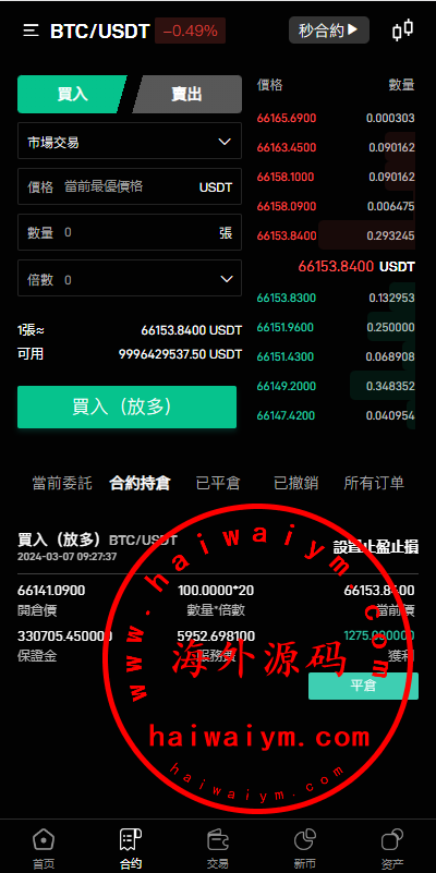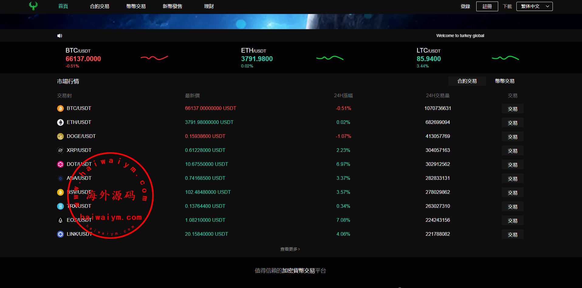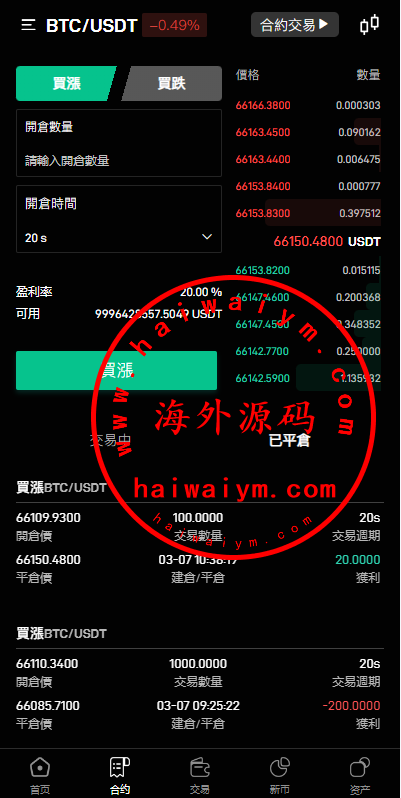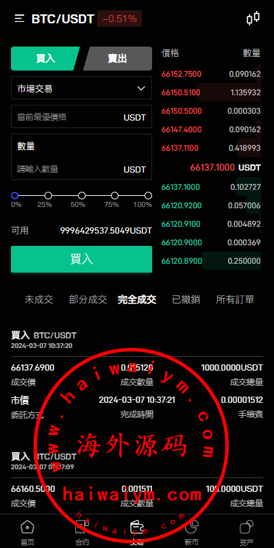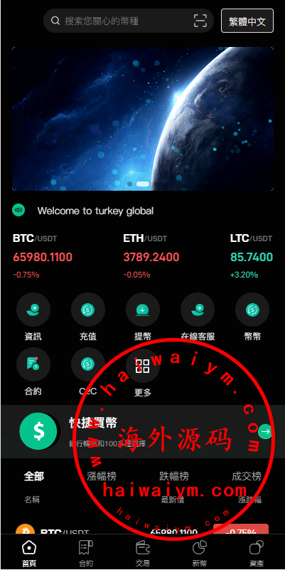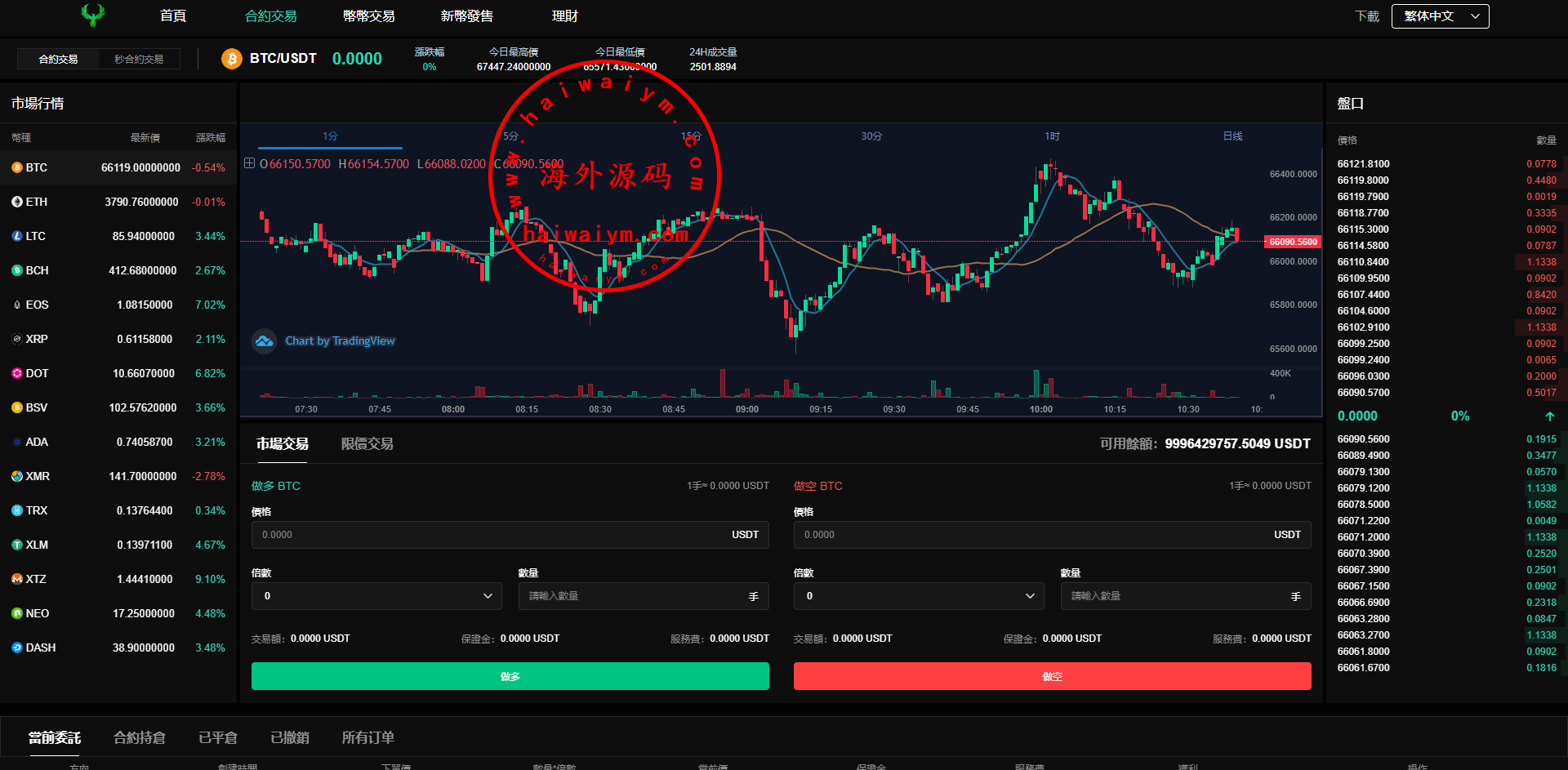系统功能很全了,ui也不错功能支持:币币交易、合约交易、秒合约交易、c2c、认购、理财等