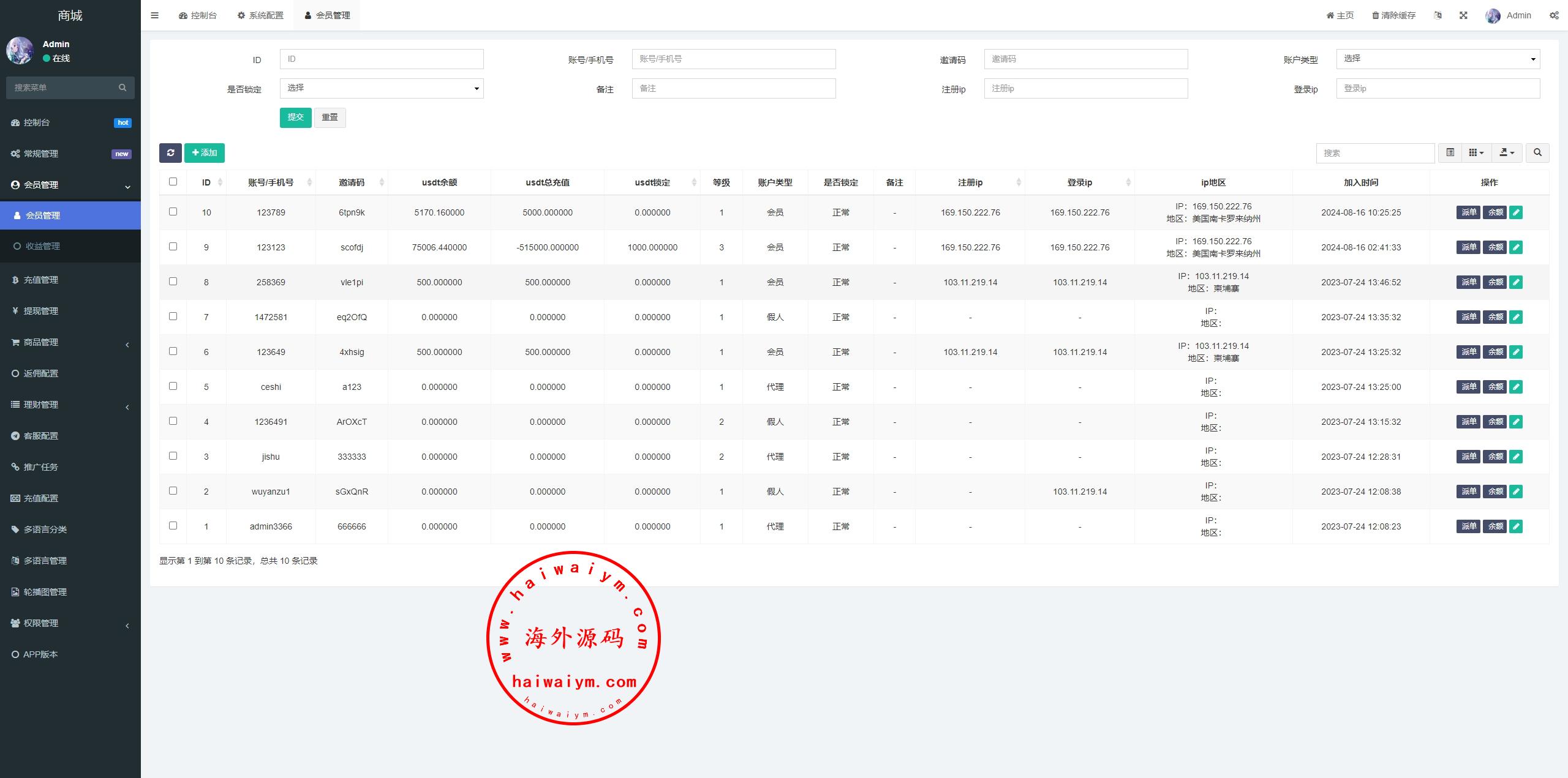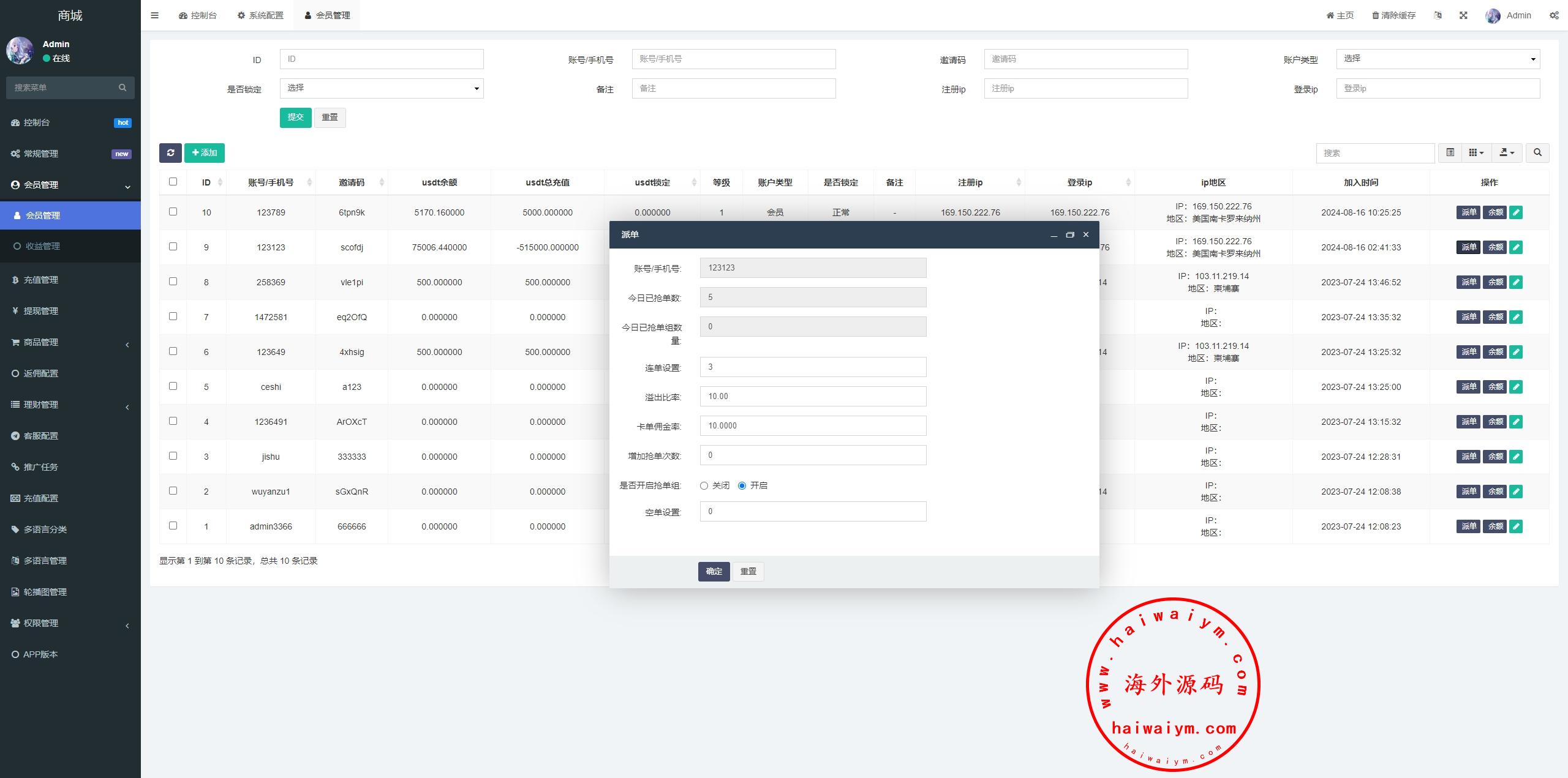 前端带多语言,余额宝,推广任务,派单卡单等功能