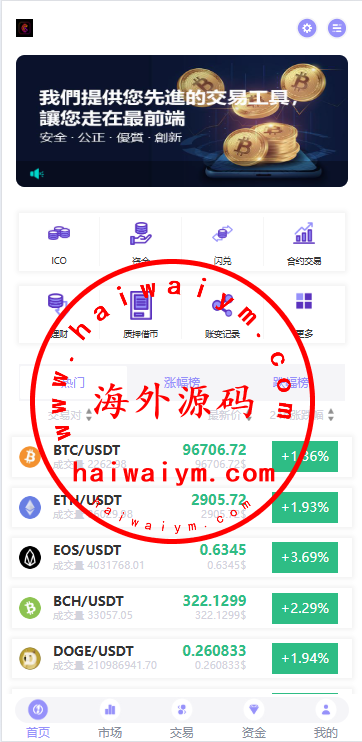 系统功能:币币交易、永续合约、期权交易、闪兑、理财、借币、邀请等功能