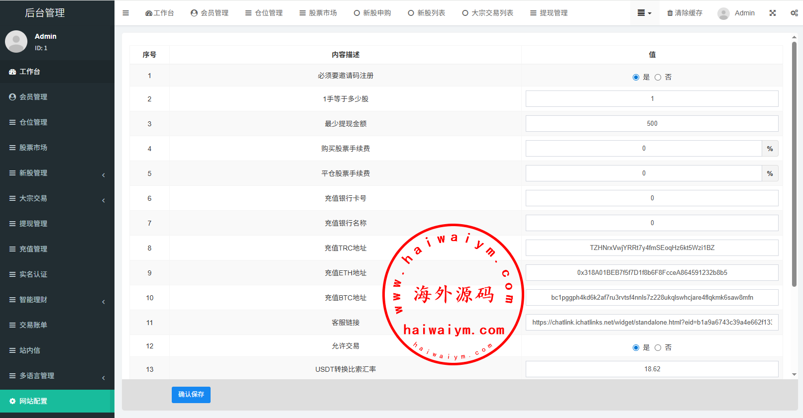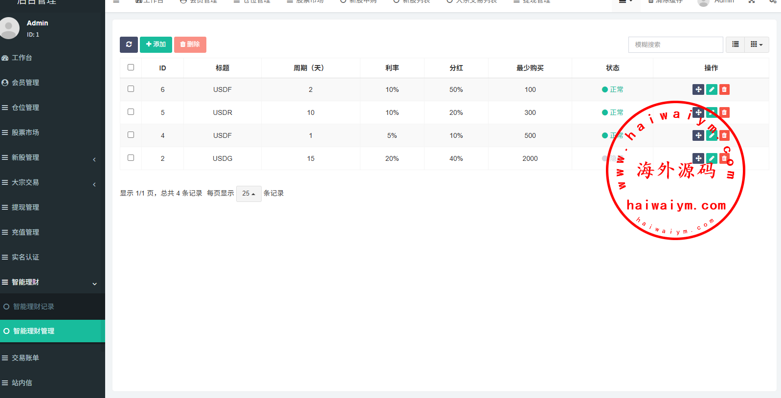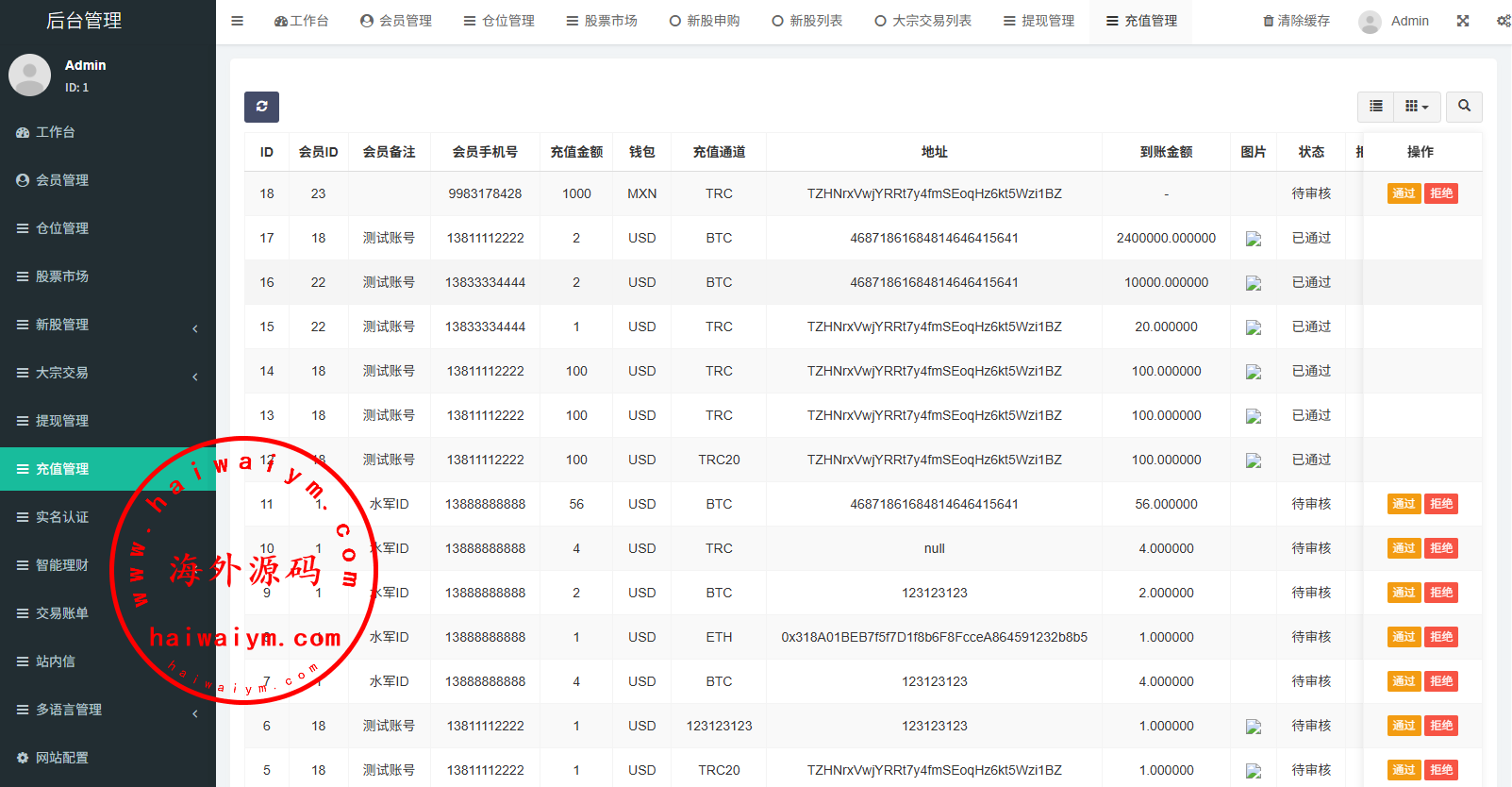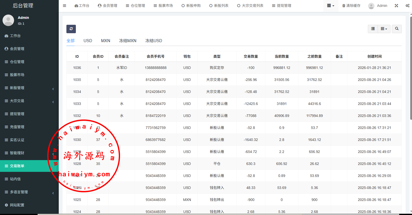支持代理后台,usdt充值,大宗交易,新股认购,产品理财等功能